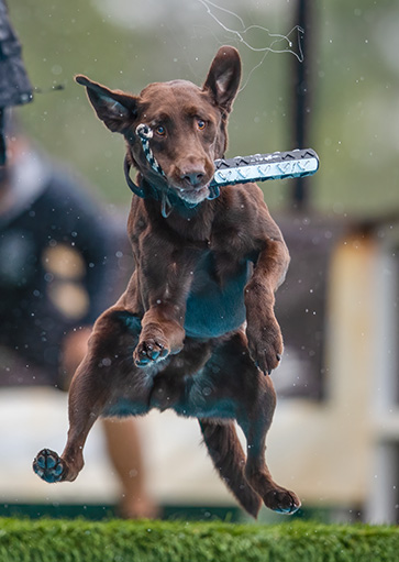 At Courteous Canine’s competition-level dock and swimming pool, dogs are exposed to the dock and then slowly into the pool. Dogs are required to know how to swim prior to signing up for this class, email your video of your dog swimming to LoveDogs@CourteousCanine.com. Many dogs are crazy for this sport, and it is gaining tremendous popularity all over the US. All breeds of dogs that are able to swim are encouraged to take this class. Courteous Canine Diving Dogs is affiliated with NADD- North American Diving Dogs.