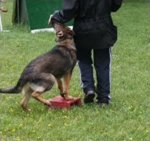 Grab that bowl and shape your dog to put her two front feet on the upside-down bowl. It can also be a small stool if the dog is large as pictured on the left. This perch will function as a target for your dog’s front feet allowing her to rotate her hind end around her front end. Put this behavior on cue in both directions. Common cues are swing and close. You will be teaching your dog to heel on both sides of your body plus upper-level competition obedience and rally require body awareness to the point that both directions are necessary in foundation training.