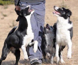 Clicker training is a physical skill; while training your dog to heel you will need to hold the food treats or toy in your left hand and the clicker in your right hand. The leash will also be in your right hand. The leash needs to be loose and forming a J-shape from the dog’s collar to your right hand (see photo above with black and white sheltie for J-shape). Holding the rewards in your left hand is ideal as rewarding the dog from your right hand would cause your shoulders to twist and pull the dog out of proper heel position by encouraging the dog to curl in front of you. What happens after the click matters as much as what you clicked, so set your dog and yourself up for success. Learn to hold several food treats in the palm of your left hand while holding one treat in between your thumb and forefinger. This will be important when your dog is heeling beautifully; this is the moment to click and reward immediately. There is no time to go treat fishing. You always have to have one treat loaded and ready to deliver in case you need to click something lovely!