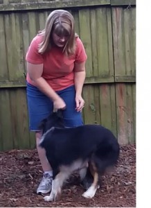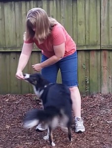 Let’s say that you would like teach your dog to spin counterclockwise first. Put a treat or two in your left hand, and put your hand in front of your dog’s nose. Use that treat like a magnet and “pull” your dog counterclockwise (toward your dog’s left).