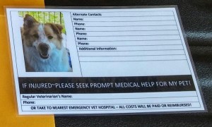 - Keep an envelope in your car with emergency contact information for both you and your pet. Include a recent photo of each pet so they can be identified easily.